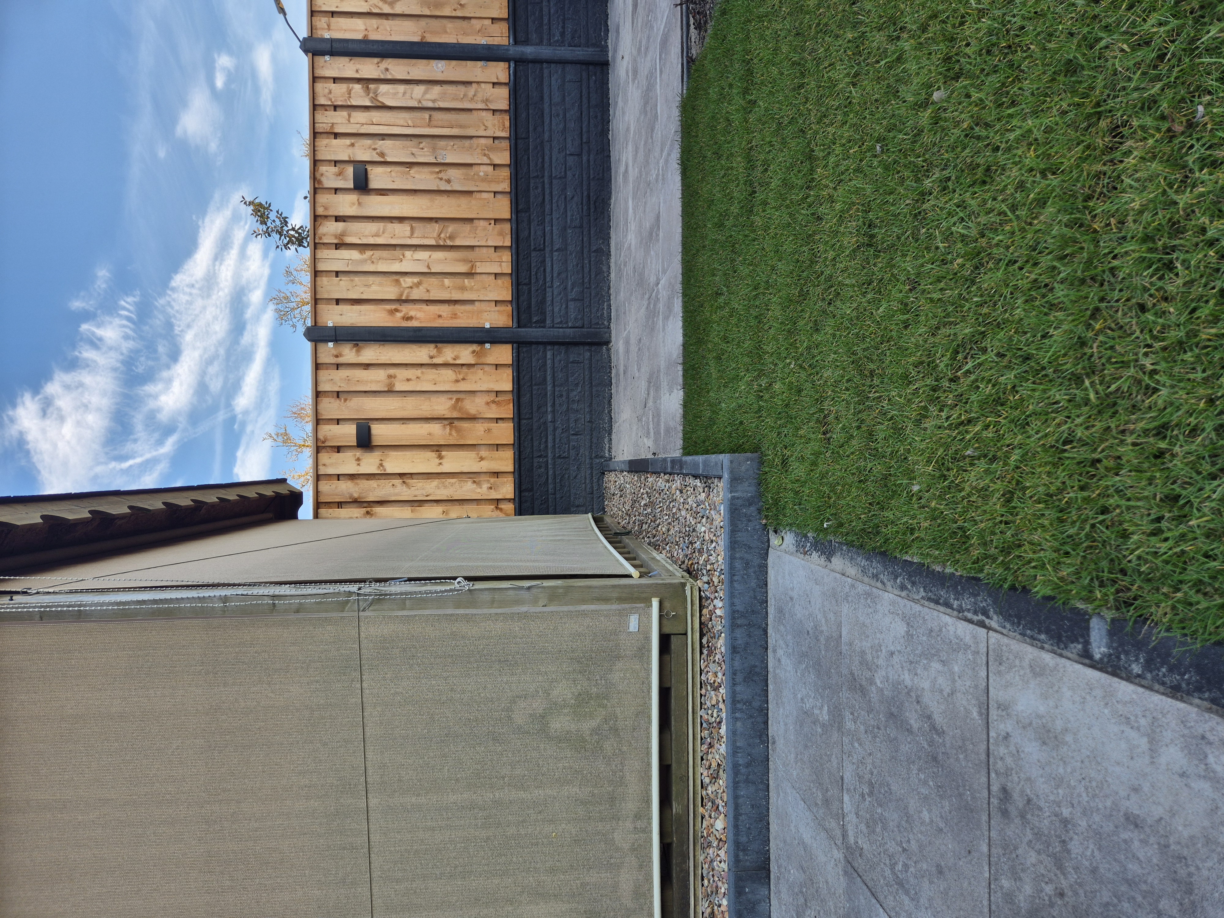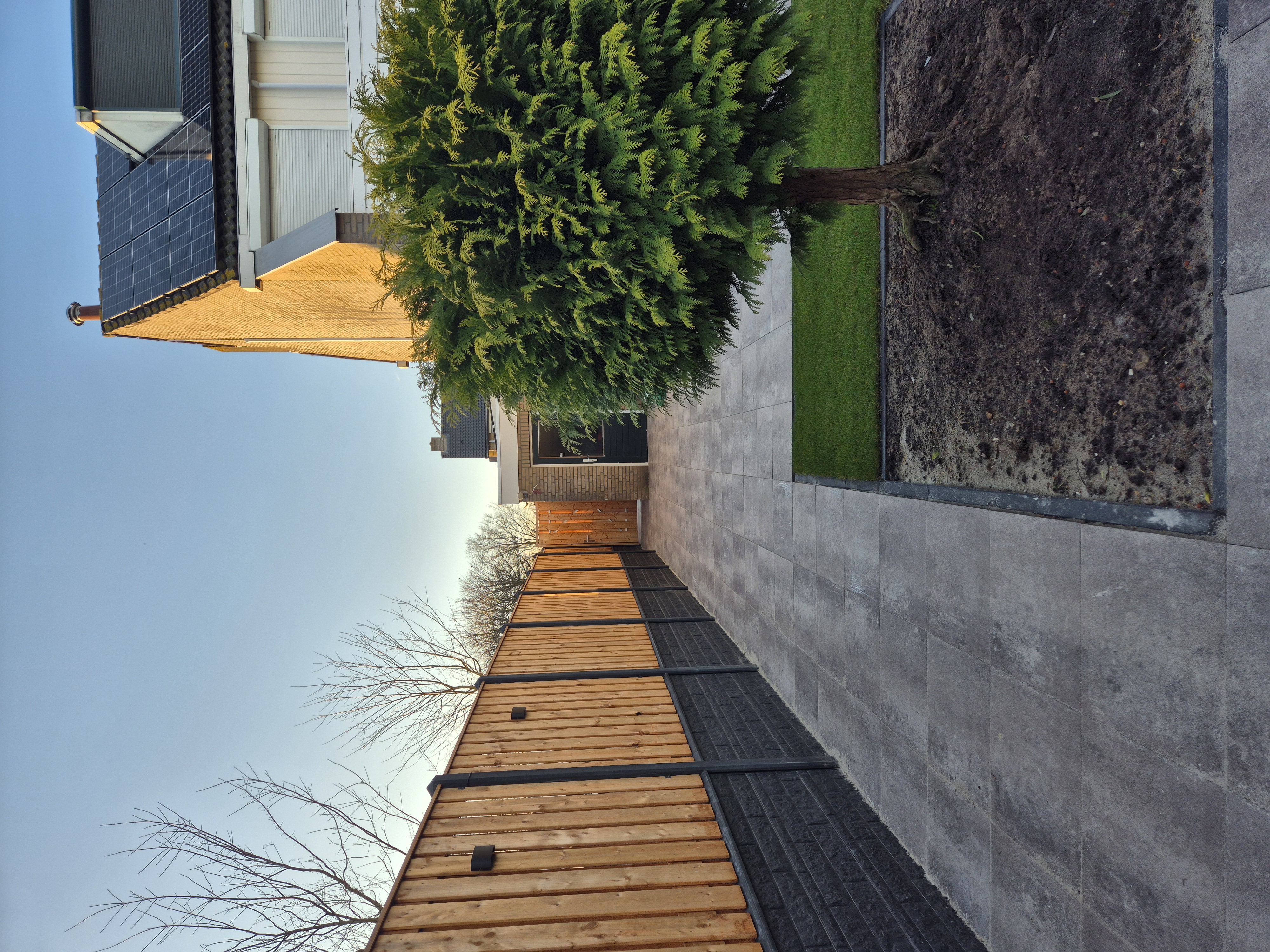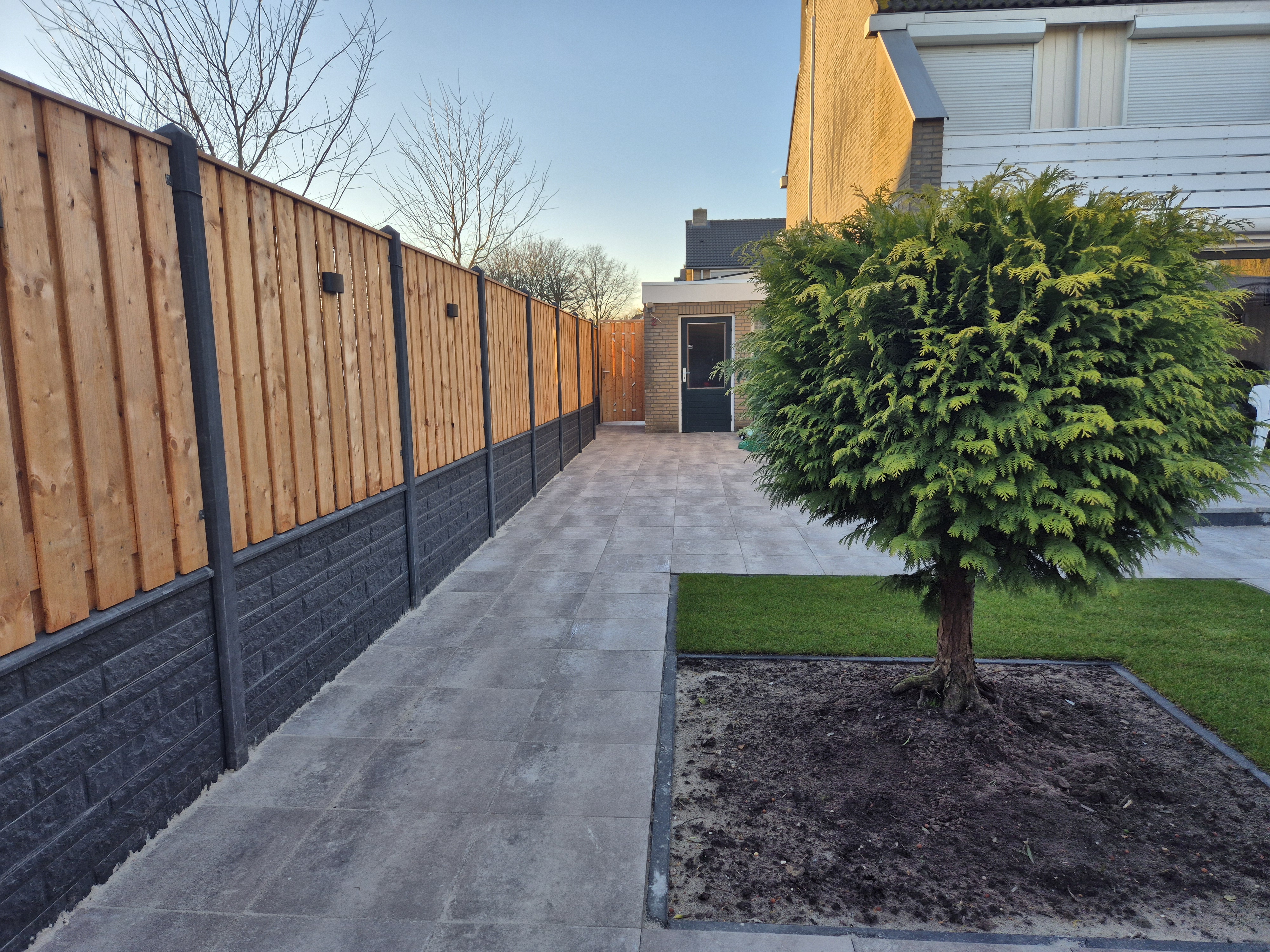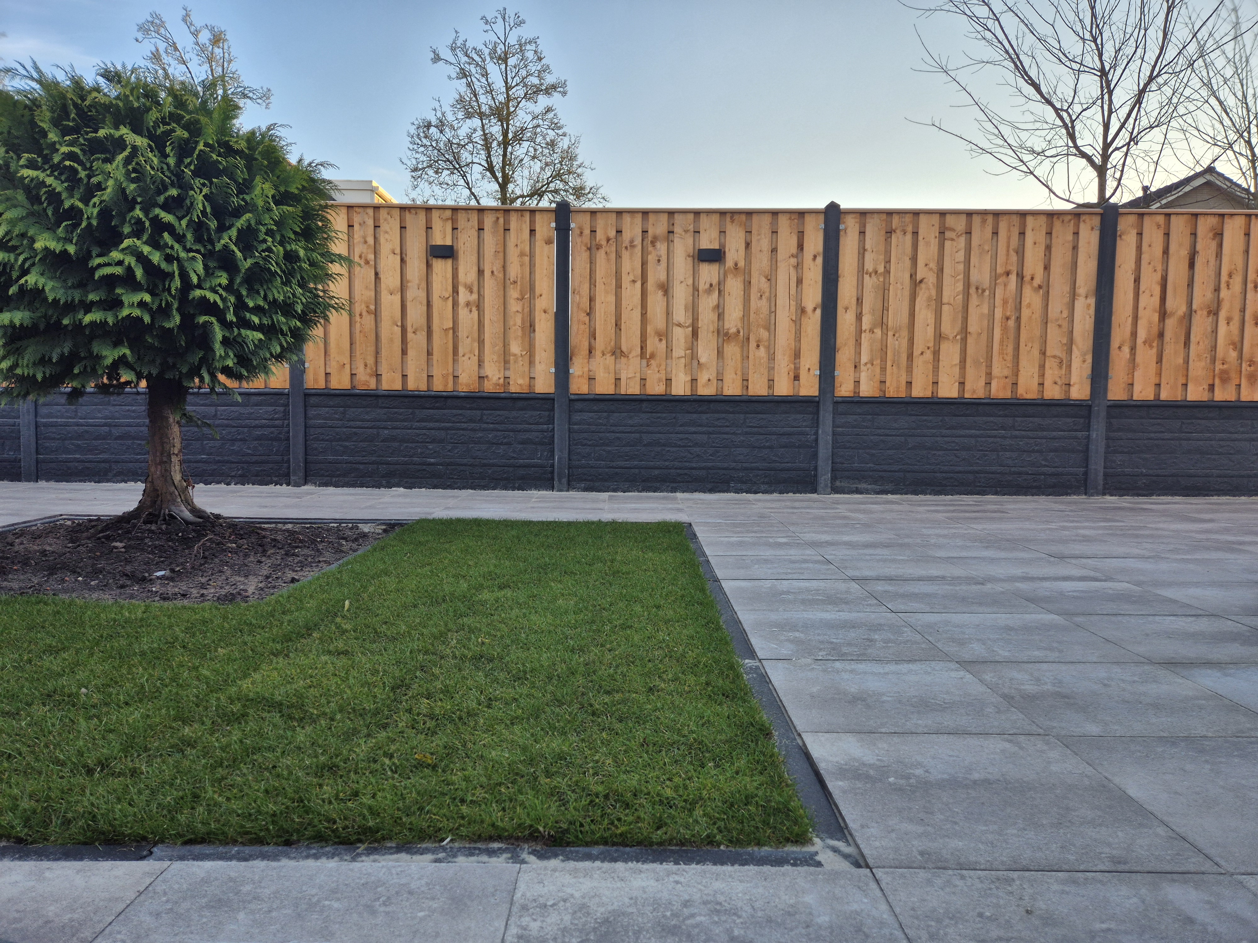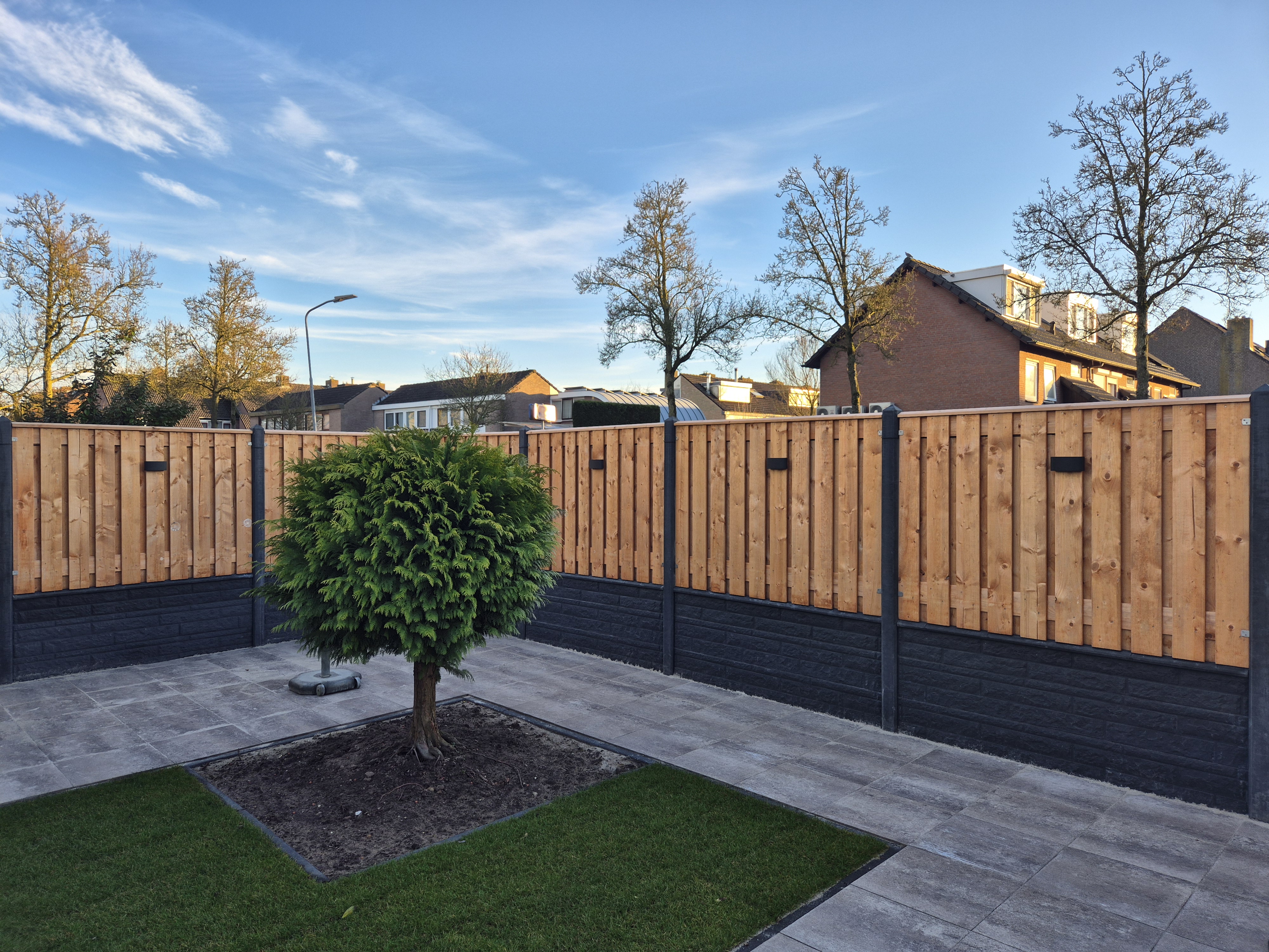 - Schutting: red class wood met antraciet beton en rotsmotief onderplaten